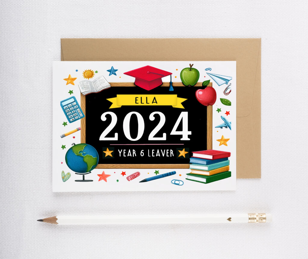 Mark your child’s milestone with our Year 6 Leavers Card 2024! Featuring a delightful school-themed design with books, a globe, and a graduation cap, this card is perfect for celebrating their primary school graduation.
